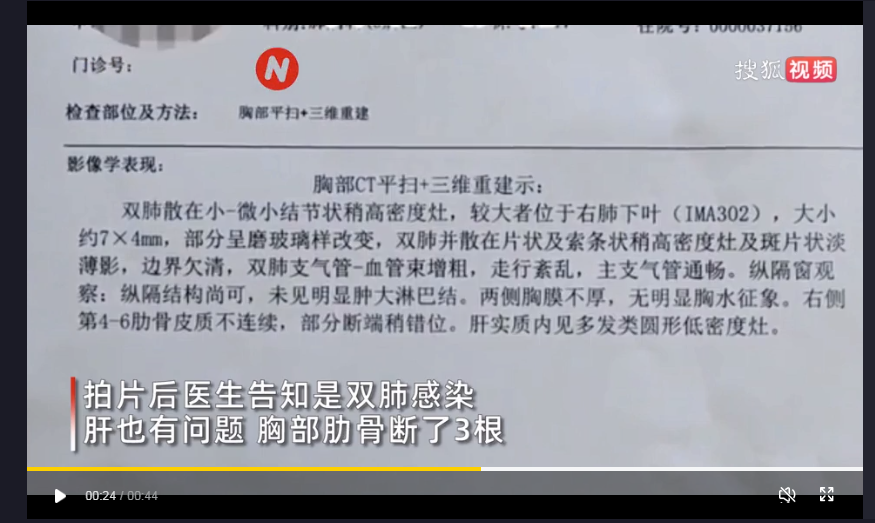 结果出来后,双肺感染,肝也有问题,胸部肋骨断了三根。